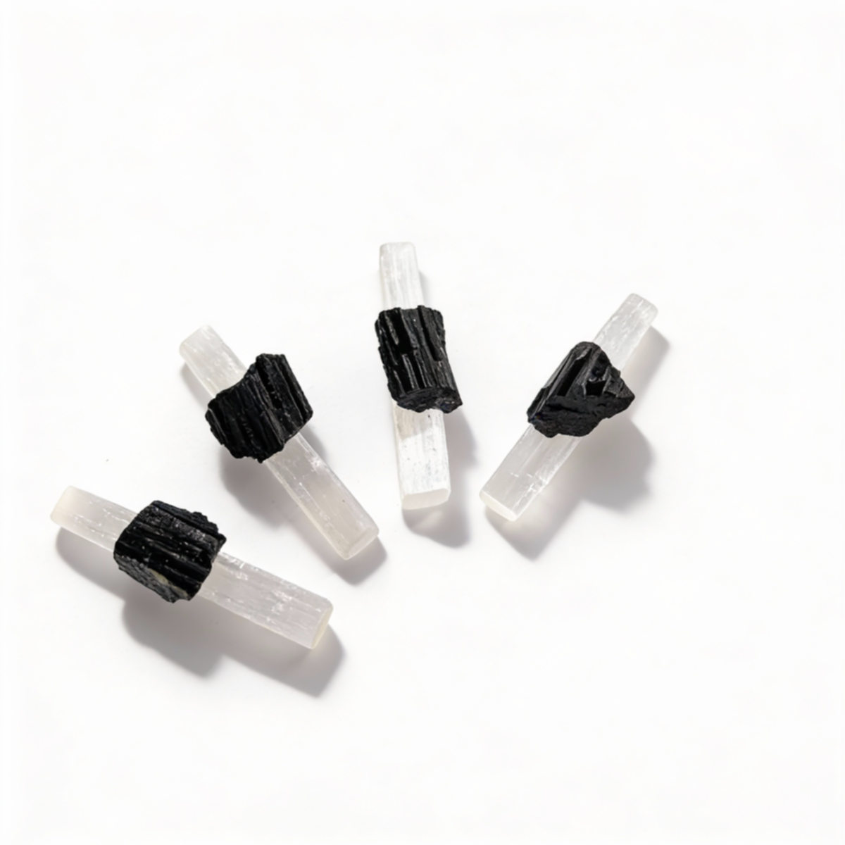 Съчетахме 4 сурови Черни Турмалина и 4 пръчки Селенит – два минерала, които присъстват в историята като най-мощните инструменти за пречистване: